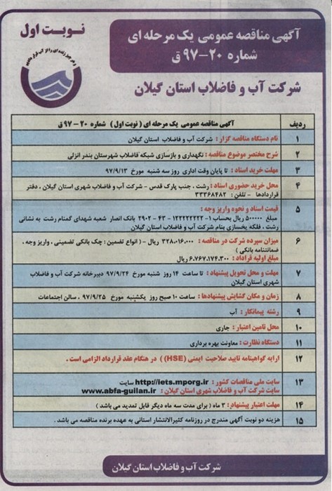 | 13 | سایت ملی مناقصات کشور: http://iets.mporg.ir سایت شرکت آب و فاضلاب شهری استان گیلان: www.abfa-guilan.ir |