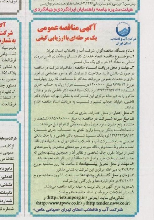 آگهی مناقصه عمومی یک مرحله ای با ارزیابی کیفی 1- نام دستگاه مناقصه گزار : شرکت آب و فاضلاب استان تهران 2- موضوع مناقصه : انجام خدمات کارکنان پیمانکاری تامین نیروی انسانی به تعداد 29 نفر برای یک سال شمسی 3- مهلت و محل دریافت اسناد مناقصه : متقاضیان شرکت در مناقصه درصورت داشتن تائید صلاحیت ازوزارت کارواموراجتماعی در امور اداری و خدمات عمومی می توانند حداکثر تا ساعت 15:00 روز چهارشنبه مورخ 14/9/97 مبلغ 000ر200(دویست هزار) ریال به حساب جاری شماره 139424259164 نزد بانک سینا شعبه دکتر فاطمی واریز و فیش مذکور را به دبیرخانه مرکزی این شرکت به نشانی : تهران ،خیابان دکتر فاطمی،خیابان حجاب تسلیم و نسبت به دریافت اسناد مناقصه اقدام نمایند. 4- محل اعتبار : از محل اعتبارات جاری شرکت 5- مبلغ سپرده شرکت در مناقصه : به مبلغ 000ر090ر685 (ششصد و هشتاد و پنج میلیون و نود هزار) ریال و به یکی از انواع ذیل می باشد : - ضمانتنامه بانکـی و یا واریز نقـدی به حساب جاری شمـاره 139424259164 نزد بانک سینا شعبه دکتر فاطمی ویاچک بانکی تضمینی به نام شرکت آب و فاضلاب استان تهران به پیشنهادهای فاقد امضاء ، مشروط ، مخدوش ، فاقد سپرده و سپرده های مخدوش یا سپرده های کمتر از میزان مقرر ، چک شخصی و نظایر آن و همچنین پیشنهاداتی که بعد از انقضای مدت مقرر واصل شود مطلقاً ترتیب اثر داده نخواهد شد. 6- مهلت ومحل تحویل پیشنهادها : تا ساعت 15:00 روز سه شنبه مورخ 27/9/97 به دبیرخانه مرکزی این شرکت به نشانی مذکور. 7- زمان ومحل گشایش پیشنهادها : ساعت 11:00 روز سه شنبه مورخ 11/10/97 در دفتر قراردادها و بازرگانی این شرکت. 8- هزینه درج آگهی دریک نوبت بعهده برنده مناقصه می باشد . 9- سایراطلاعات مربوطه دراسنادمناقصه مندرج است. نشانی های سایت اینترنتیhttp://iets.mporg.ir) و (http:tender.nww.co.ir ) (http:tender.nww.co.ir)و(ir.tpww.co www.//:http ) |