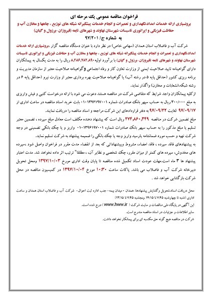فراخوان مناقصه عمومی یک مرحله ای برونسپاری ارائه خدمات امداد،نگهداری و تعمیرات و انجام خدمات پیشگیرانه شبکه های توزیع ، چاهها و مخازن آب و حفاظت فیزیکی و اپراتوری تاسیسات شهرستان نهاوند و شهرهای تابعه (فیروزان-برزول و گیان) به شماره ج/ 201/97 شرکت آب و فاضلاب استان همدان (سهامی خاص) در نظر دارد با عنوان دستگاه مناقصه گزار ، برونسپاری ارائه خدمات امداد،نگهداری و تعمیرات و انجام خدمات پیشگیرانه شبکه های توزیع ، چاهها و مخازن آب و حفاظت فیزیکی و اپراتوری تاسیسات شهرستان نهاوند و شهرهای تابعه (فیروزان-برزول و گیان) با برآورد اولیه8.286.782.890 ریال را به مدت یکسال به پیمانکاران دارای گواهینامه تایید صلاحیت ایمنی از وزارت تعاون کار و رفاه اجتماعی وگواهینامه صلاحیت معتبر از سازمان مدیریت و برنامه ریزی کشور (حداقل پایه 5 در رشته آب) یا گواهینامه صلاحیت بهره برداری معتبر از وزارت نیرو (حداقل پایه 6 در رشته شبکه،انشعابات و مخازن) واگذار نماید. ازکلیه پیمانکاران واجد شرایط که متقاضی شرکت در مناقصه هستند دعوت می شود با ارائه درخواست کتبی و فیش واریزی به مبلغ 000/300 ریال به حساب سپهر بانک صادرات شماره 0101396197001 بابت خرید اسناد مناقصه در ساعت اداری از 17/09/97 لغایت 22/09/97 به دفتر قراردادهای این شرکت مراجعه و اسناد مناقصه را دریافت نمایند. مبلغ تضمین شرکت در مناقصه 274.860.349 ریال است که پیشنهاد دهنده مکلف است معادل مبلغ سپرده ، تضمین معتبر تسلیم یا مبلغ مذکور را به حساب سپهر بانک صادرات شماره 0101396197001 واریز و یا چک بانکی تضمینی در وجه شرکت تهیه و حسب مورد ضمانتنامه یارسید واریز وجه یا چک بانکی را ضمیمه پیشنهاد به شرکت تسلیم نماید. به پیشنهادهای فاقد سپرده ، فاقد امضاء، مشروط وپیشنهاداتی که بعد از انقضاء مدت مقرر در فراخوان واصل شود ،سپرده های مخدوش، سپرده های کمتر از میزان مقرر، چک شخصی و نظایر آن، ، مطلقا" ترتیب اثر داده نخواهد شد. مدت اعتبار پیشنهاد ها 3 ماه است.مهلت عودت اسناد تکمیل شده مناقصه تا پایان وقت اداری مورخ 03/10/1397 ومحل تحویل دبیرخانه شرکت آب و فاضلاب می باشد. پاکات ساعت 10:30 مورخ 04/10/1397 در کمیسیون مناقصه در محل شرکت بازگشایی خواهد شد . محل دریافت اسناد،تحویل وگشایش پیشنهادها: همدان - میدان بیمه- جنب اداره ثبت احوال- شرکت آب و فاضلاب استان همدان و ساعت اداری (شنبه تا چهارشنبه 7:45 تا 14:15 ،پنجشنبه 7:45 تا 13:15) این آگهی در پایگاه ملی مناقصات و سایت شرکت (www.hww.ir ) درج شده است. سایر اطلاعات و جزئیات در اسناد مناقصه مندرج است. شرکت در مناقصه هیچ گونه حق مکتسبه ای برای پیمانکار نخواهد داشت. تصوير آگهی |