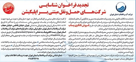 از كليه شركتهای مبتنی بر اپلیکیشن فعال در حوزه حملونقل دعوت میشود جهت اعلام آمادگی و شرکت در جلسات توجیهی و فنی، مستتندات زیر را حداكثر تا تاریخ 24/08/1404 به یکی از روشهای فیزیکی به نشانی: تهران، خ فاطمی، خ حجاب، شرکت آب و فاضلاب استان تهران، ضلع شرقی شرکت، دفتر قراردادهای شرکت آب و فاضلاب استان تهران، پست الکترونیک به نشانی gharardad@tpww.ir و یا از طریق شماره دورنگار 02188967111 ارسال نمایند. دعوتنامه شرکت در جلسه توجیهی و فنی متعاقباً برای متقاضیان ارسال خواهد گردید.