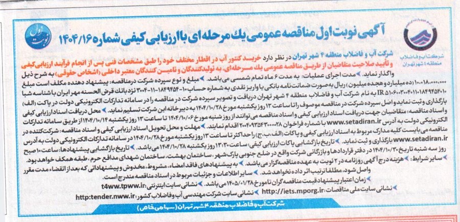 شركت آب و فاضلاب منطقه چهار شهر تهران در نظر دارد خرید کنتور آب در اقطار مختلف خود را طبق مشخصات فنی پس از انجام فرايند ارزيابي كيفي و تأييد صلاحيت متقاضيان از طريق مناقصه عمومي يك مرحله¬اي، به تولیدکنندگان و تامین کنندگان معتبر داخلی (اشخاص حقوقی) به شرح ذيل واگذار نمايد.