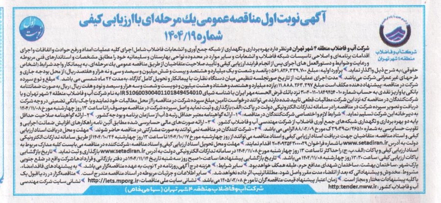 آگهي نوبت اول مناقصه عمومي يك مرحلهاي با ارزیابی کیفی شماره 19/1404