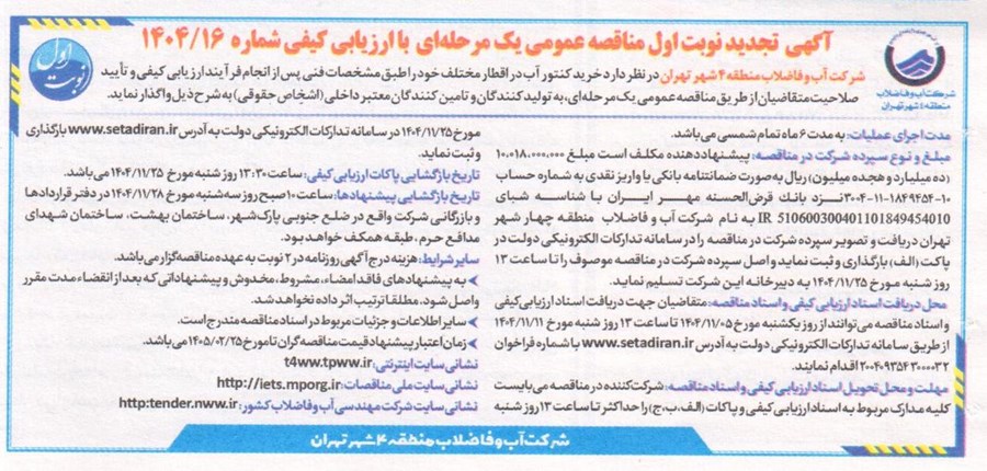 شركت آب و فاضلاب منطقه چهار شهر تهران در نظر دارد خرید کنتور آب در اقطار مختلف خود را طبق مشخصات فنی پس از انجام فرايند ارزيابي كيفي و تأييد صلاحيت متقاضيان از طريق مناقصه عمومي يك مرحله¬اي، به تولیدکنندگان و تامین کنندگان معتبر داخلی (اشخاص حقوقی) به شرح ذيل واگذار نمايد.