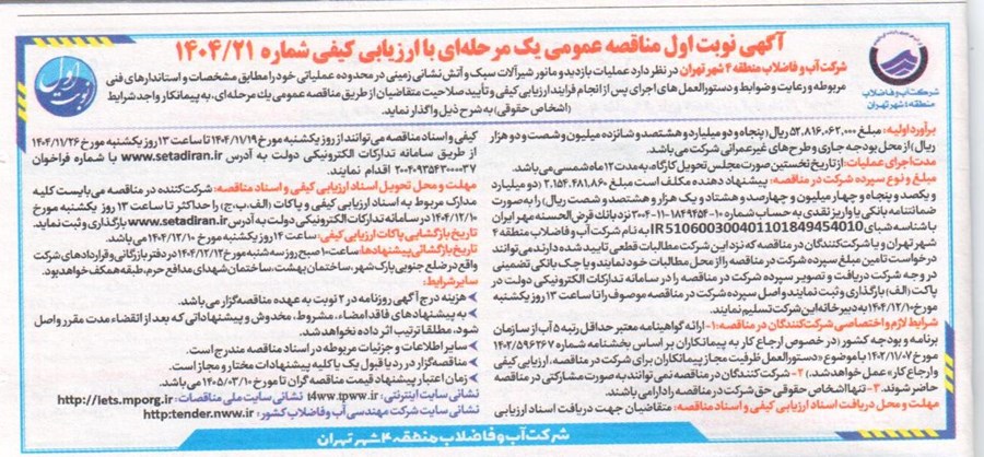 آگهي نوبت اول مناقصه عمومي يك مرحلهاي با ارزیابی کیفی شماره 21/1404
