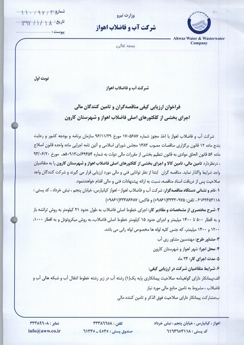شرکت آب و فاضلاب اهواز فراخوانارزیابیکیفیمناقصهگران و تامین کنندگان مالی اجرای بخشی از کلکتورهای اصلی فاضلاب اهوازو شهرستان کارون شرکت آب و فاضلاب اهواز با اخذ مجوز شماره 1705687 مورخ 29/11/96 سازمان برنامه و بودجه کشور و رعایت بندج ماده 12 قانون برگزاری مناقصات مصوب 1383 مجلس شورای اسلامی و آئین نامه اجرایی ماده واحده قانون اصلاح ماده 56 قانون الحاق موادی به قانون تنظیم بخشی از مقررات مالی دولت به شماره 69454/ت50913هـ مورخ 20/06/93 ، درنظردارد تامین مالی، تامین کالا واجرای بخشی از کلکتورهای اصلی فاضلاب اهواز و شهرستان کارون را به متقاضیان واجد شرایطواگذار نماید. مناقصه گرانابتدا از نظر توانایی فنی و مالی مورد ارزیابی قرار می گیرند و شرکت کنندگان واجد صلاحیت پس از دریافت اسناد مناقصه، نسبت به ارائه پیشنهادات فنی و مالی اقدام خواهندنمود. 1-نامونشانیدستگاهمناقصهگزار:شرکت آب و فاضلاب اهواز- اهواز کیانپارس، خیابان پنجم ، نبشخرداد ، کد پستی : 6163653118 ،تلفن: 33330975(9861+)وفاکس: 33386687(9861+) 2-شرحمختصریازمشخصاتومقادیرکار: اجرای خطوط اصلی فاضلاب به طول حدود 21 کیلومتر به روش ترانشه باز و به اقطار 500 تا 1400 میلیمتر و اجرای حدود 15 کیلومتر خطوط اصلی فاضلاب، به روش میکروتونل و به اقطار 1000، 1200 و 1400 میلیمتر، که جنس کلیه لوله ها مخصوص لوله رانی می باشد. 3-مشاور طرح: مهندسین مشاور ری آب 4-محلاجرا: شهر اهواز و شهرستان کارون 5-مدتاجرایکار: 24ماه 6-شرایطمتقاضیانشرکتدرارزیابیکیفی: الف:پیمانکار دارای گواهینامه صلاحیت پیمانکاری پایه یک(1) رشته آب در زیر رشته خطوط انتقال آب و شبکه هالی آب و فاضلاب ، مشروط به تامین منابع مالی مورد نیاز ب:مشارکت پیمانکار دارای صلاحیت فوق الذکر و تامین کننده مالی 7-شرایط کلی: بازپرداخت اصل و سود تسهیلات توسط سازمان مدیریت وبرنامه ریزی کشور تضمین خواهد شد. شروع باز پرداخت تسهیلات یکسال پس از تحویل موقت پروژه و مدت بازپرداخت سود و اصل تسهیلات به مدت چهار سال با اقساط شش ماهه می باشد. محاسبه سود و بازپرداخت تسهیلات درچارچوب قانون عملیات بانکی بدون ربا مصوب 1362 با رعایت عقود اسلامی مندرج در آن و حداکثر نرخ سودمورد پذیرش تا نرخ سود اوراق مشارکت خواهد بود. نرخ سود مورد انتظار و مبلغ هر قسط بازپرداخت، توسط تامین کننده منابع مالی پیشنهاد می شود و و تامین کننده می بایست اسنادی دال بر توانایی تامین مالی تسهیلات تعهد شده که مورد قبول دستگاه اجرایی باشد، ارائه نماید. 8- تاریخ،مهلت،ومحلدریافتاسنادارزیابی: واجدینشرایطمیتوانندحداکثر تا پایان وقت اداریروز یکشنبه مورخ 26/01/97 جهت دریافتاسناد،ازمهندسین مشاور ری آب به نشانی تهران- خیابانآفریقا- کوچه فرزان غربی پلاک 30 ،اقدامنمایند. دریافتاسنادارزیابیتنهابابههمراهداشتنمعرفینامهکتبیودرقبالارائهفیشبانکیبهمبلغ300.000ریالواریزیبهحسابشماره 0105155272002 نزدبانک ملی بنام مهندسین مشاور ری آب امکان پذیر خواهد بود. 9-تاریخ،مهلتومحلتحویلاسنادارزیابی: مناقصهگرانپسازدریافتومطالعهاسنادارزیابی،حداکثرتاآخروقتاداریمورخ09/02/97اسنادمربوطراتکمیلودرپاکتلاکومهرشدهبهنشانی اهواز – کیانپارس-خیابان 5 غربی نبش خرداد شرکت آب و فاضلاب اهواز- طبقه سوم دفتر قراردادها(تلفن 06133737214) تحویلورسیددریافتدارند. مناقصهگرانمیتوانندبرایکسباطلاعاتبیشتروبیانسوالاتاحتمالیخودبامهندسین مشاور ری آببه نشانی ذکر شده در بالامکاتبه و یا با شماره تلفن 8309 داخلی 309 تماس حاصل نمایند. |