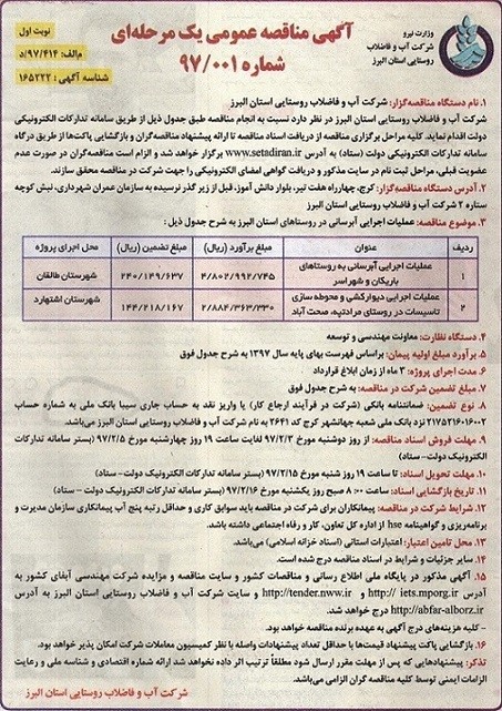 برونسپاری ارائه خدمات امداد، نگهداری و تعمیرات ، انجام خدمات پیشگیرانه شبکه های توزیع آب ، چاهها و مخازن آب و حراست فیزیکی از تاسیسات شهرستان کبودراهنگ
